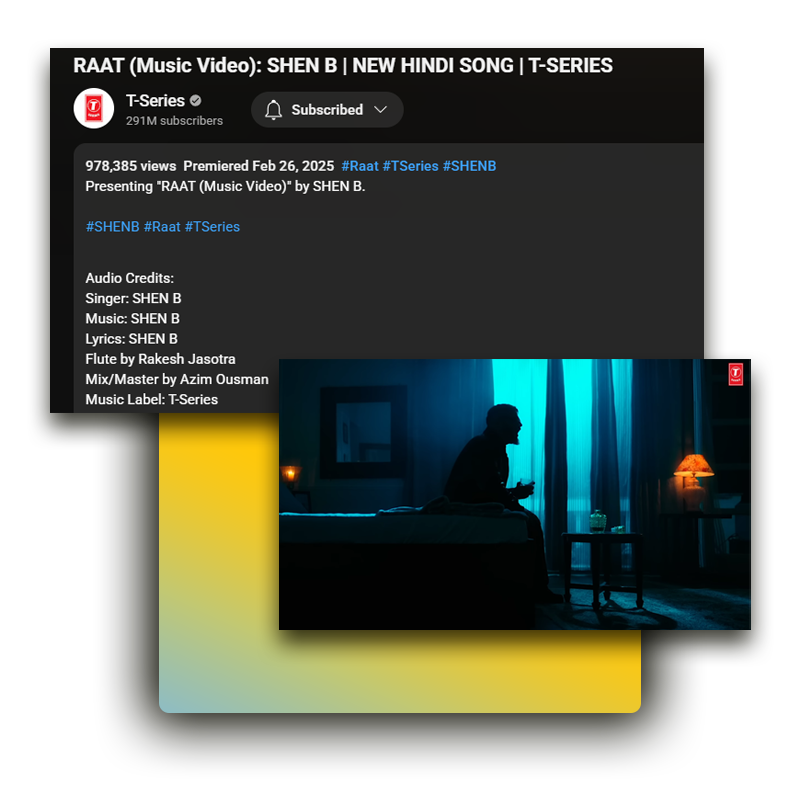 Engineered the track "RAAT" by Shen B, Mixed and Mastered for T-Series — one of the world’s largest music labels. This single reached millions of listeners worldwide, amplifying my work to an international stage.