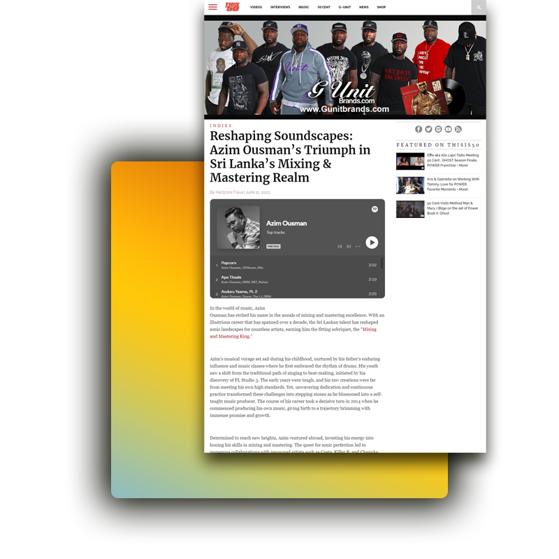 Azim Ousman, known in the music industry as the King of Mixing and Mastering in Sri Lanka, embarked on his artistic journey in 2006 as a music producer. With a deep passion for R&B music, he seamlessly transitioned into the vibrant world of Hip Hop, carving out a significant niche for himself over the past 15 years. His dedication and talent have solidified his place within the Sri Lankan music scene.