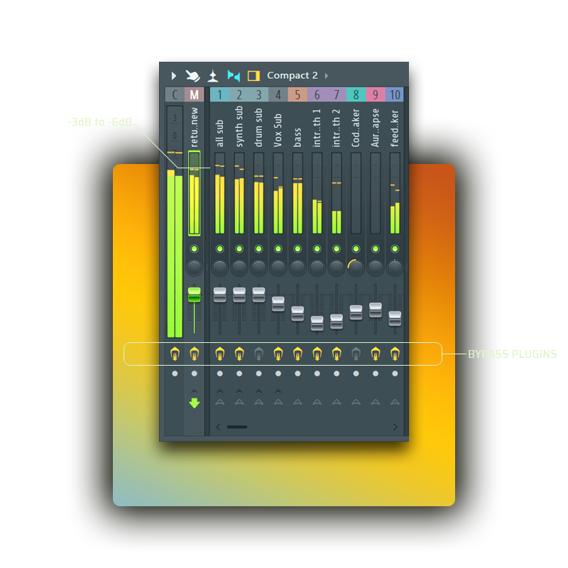 Make sure no tracks are distorting — peak levels should sit around -3dB to -6dB